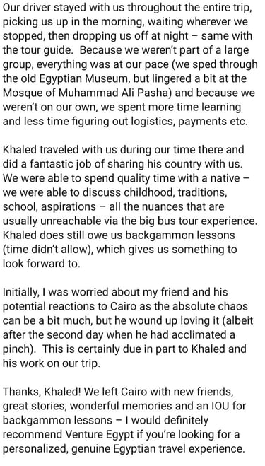 From the bustling streets of Cairo to the serene desert nights, this trip was a perfect blend of adventure and cultural immersion.
